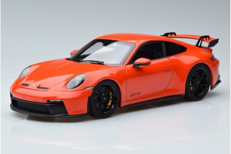 A 1:18 scale model measures approximately 25–28 cm (ca. 10–11 Zoll). The Porsche 911 992 GT3 Coupe Orange Norev 1:18 is perfect for display in a glass cabinet or on a shelf.